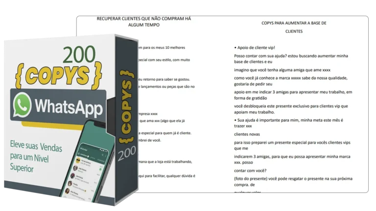 Te falta idéia para suas mensagens de Vendas? Agora não falta mais! São 200 copys para recuperar ou conquistar vendas dos mais diversos clientes no seu WhatsApp.